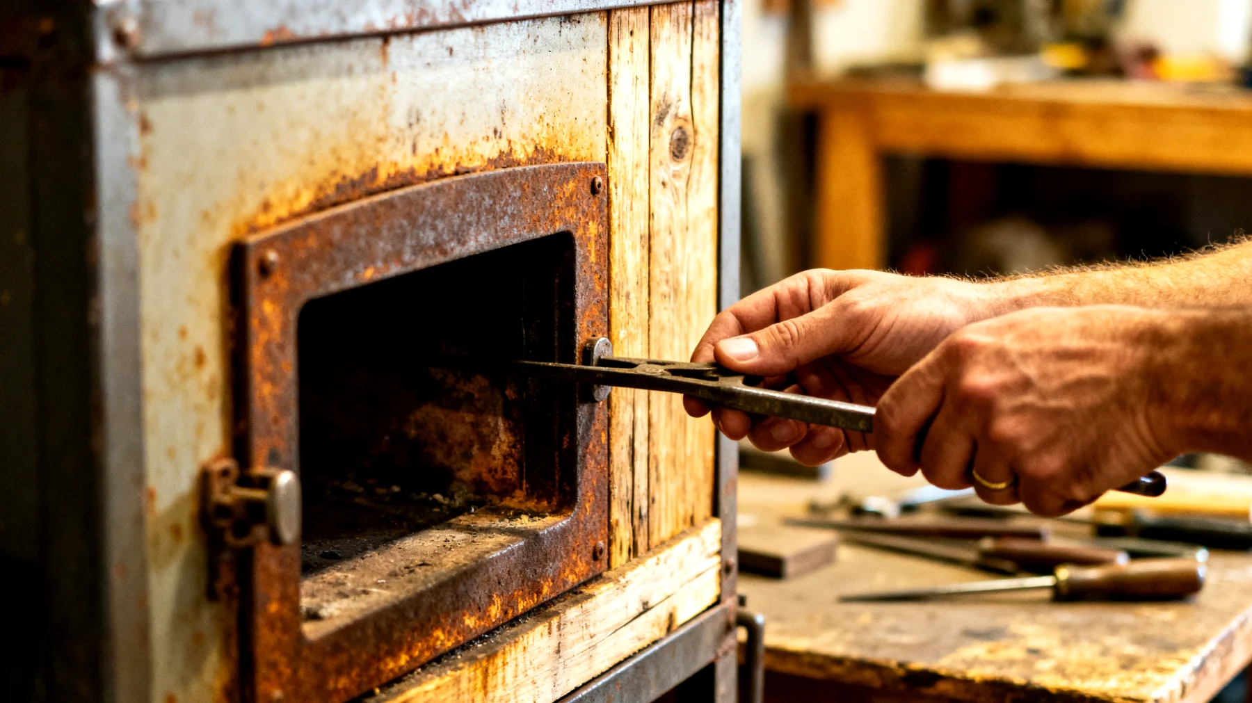 Alle elektrischen Komponenten, Dichtungen, Glasfenster und Kunststoffteile müssen entfernt werden. Übrig bleiben die Metallstruktur und die innere Garkammer. Diese dient später als Brenn- oder Hitzeraum. Bei diesem Schritt ist Vorsicht geboten: Alte Isoliermaterialien können Fasern enthalten, die beim Ausbau nicht eingeatmet werden sollten. Eine Staubmaske und gute Belüftung sind empfehlenswert.